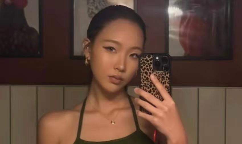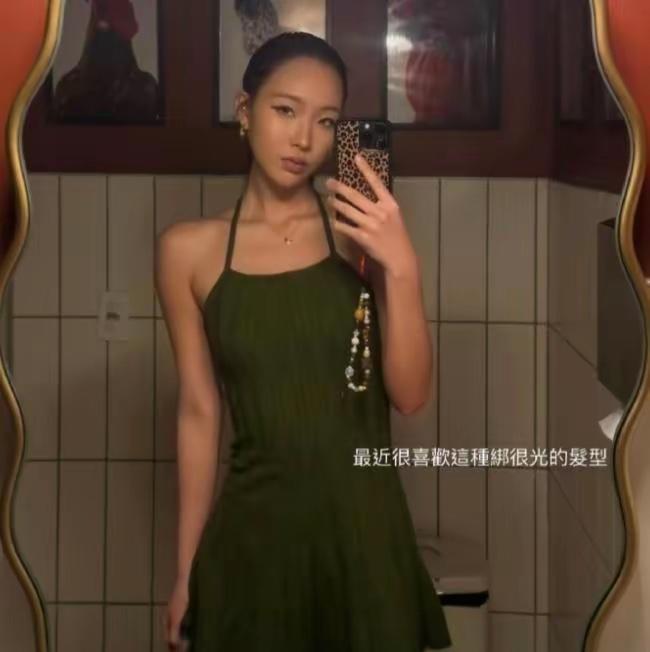 照片里小麦色皮肤配上挂脖吊带,烟熏妆加上大光明发型,连手机壳都选了豹纹系,妥妥的西式辣妹范儿。其实这姑娘先天条件真不错,个子高挑,头肩比优越,脸型也是近乎完美的鹅蛋脸。驾驭这种热辣造型毫无压力,扎起头发更显得五官立体精致,眼神里多了些成熟与迷离。